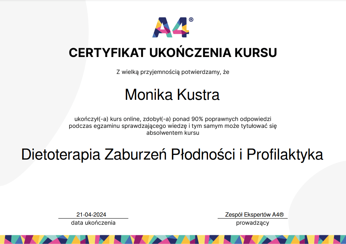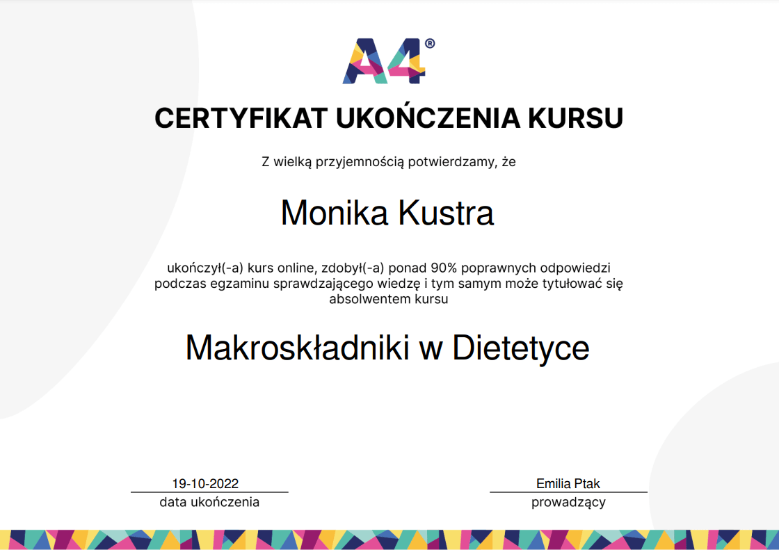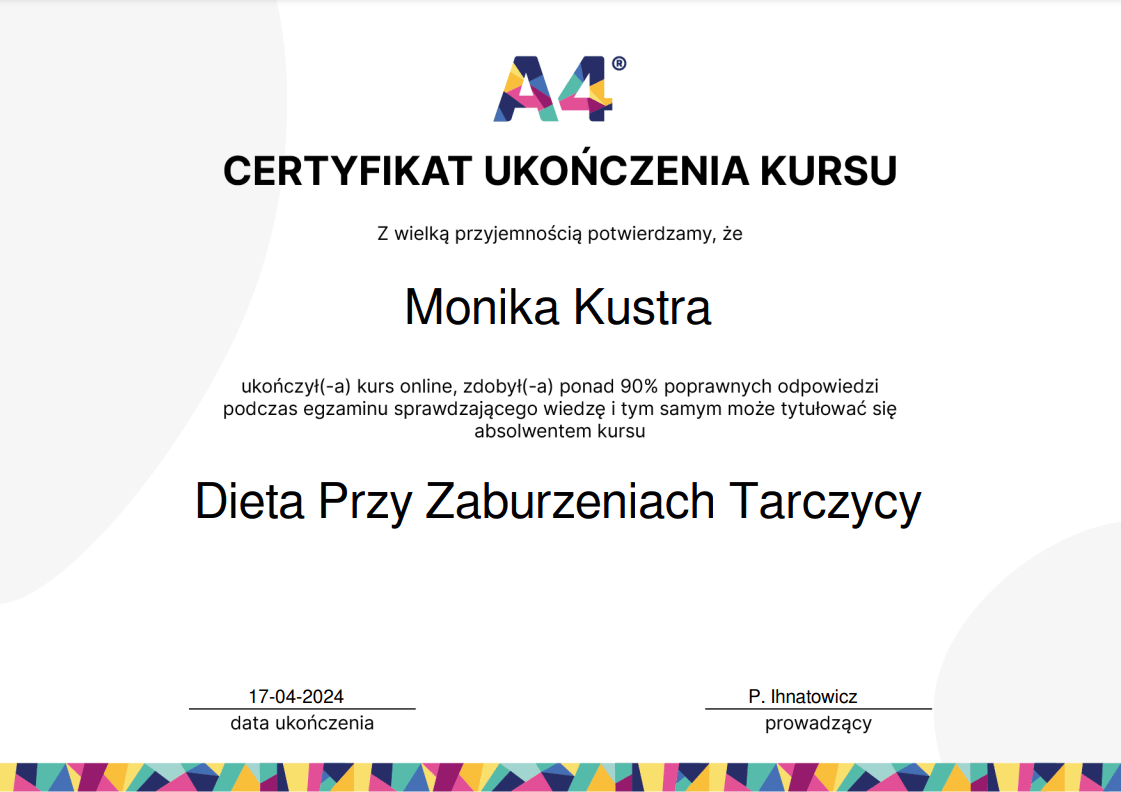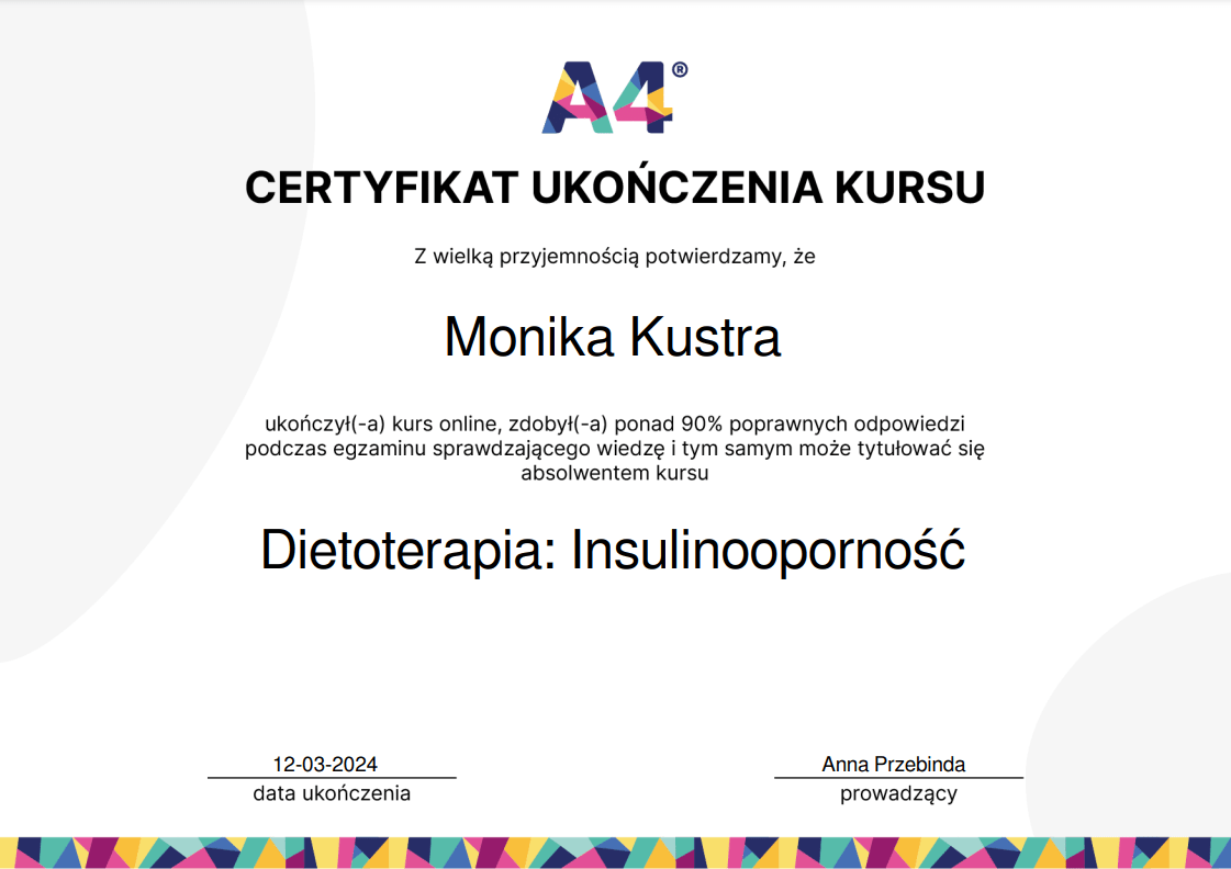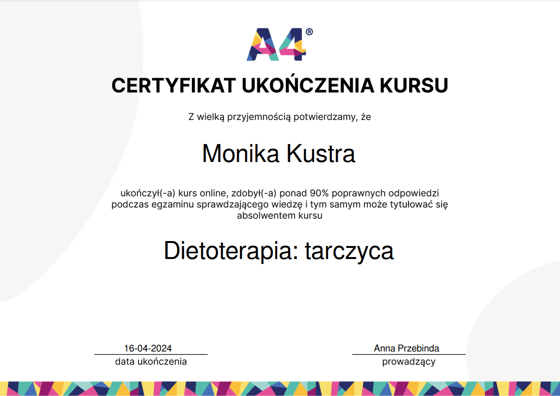 Nieustannie poszerzam swoją wiedzę – ukończyłam wiele szkoleń z psychodietetyki, diet coachingu oraz dietoterapii w różnych schorzeniach, takich jak choroby tarczycy, nerek czy cukrzyca. Wierzę, że indywidualne podejście to klucz do sukcesu, dlatego oferuję Ci nie tylko wiedzę, ale i wsparcie na każdym etapie naszej współpracy.
