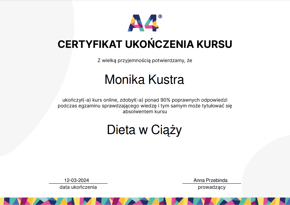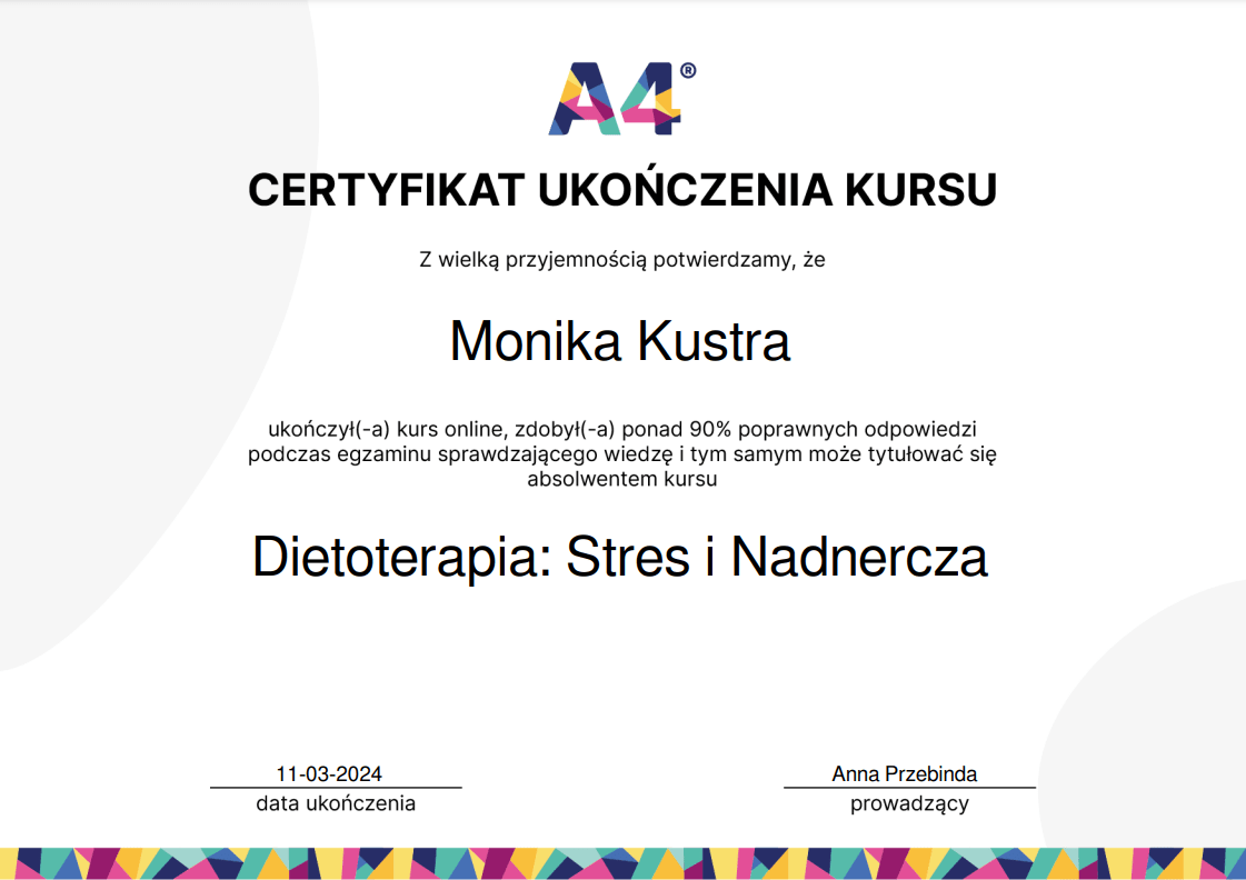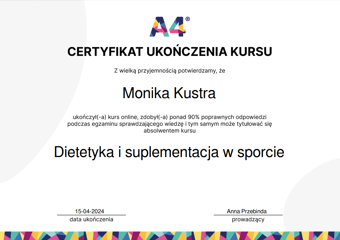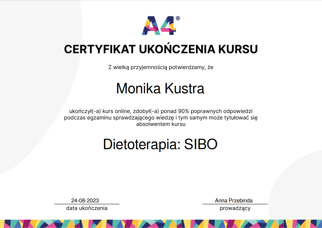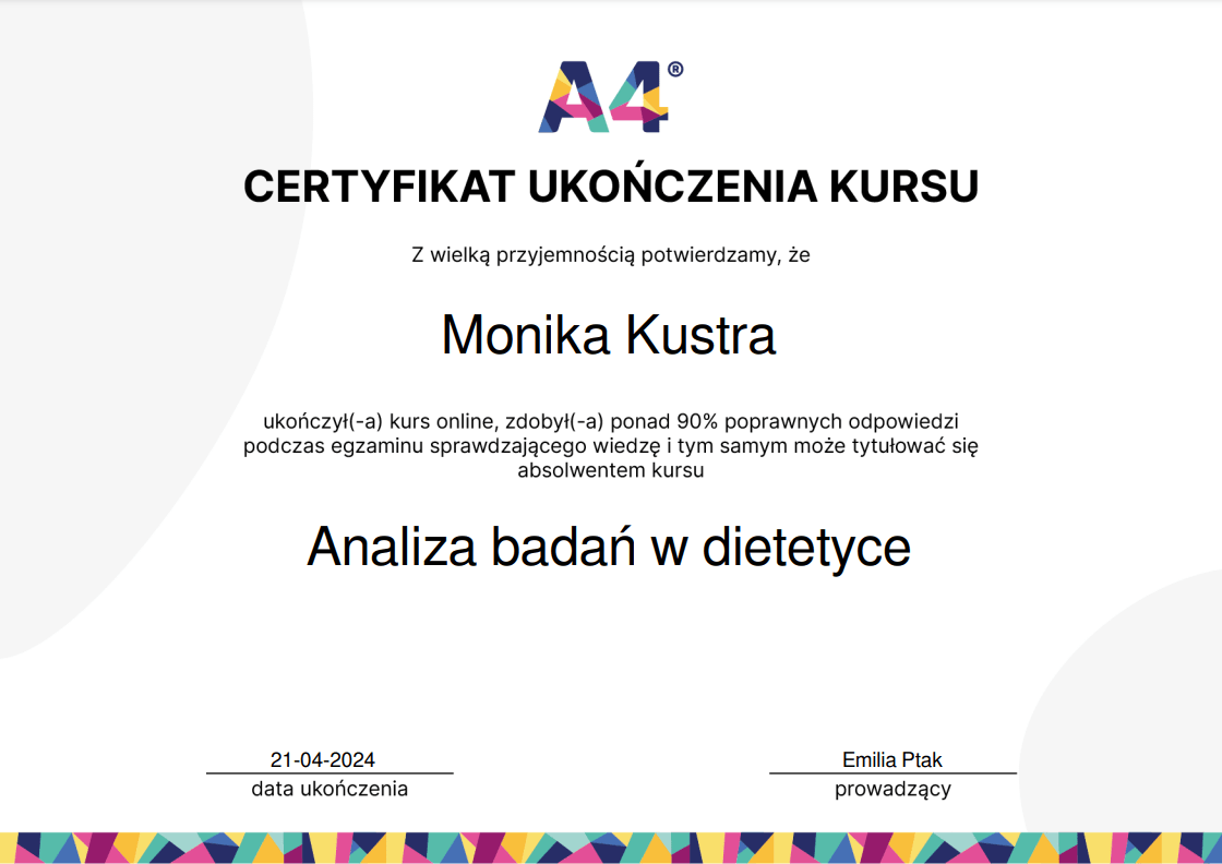 Nieustannie poszerzam swoją wiedzę – ukończyłam wiele szkoleń z psychodietetyki, diet coachingu oraz dietoterapii w różnych schorzeniach, takich jak choroby tarczycy, nerek czy cukrzyca. Wierzę, że indywidualne podejście to klucz do sukcesu, dlatego oferuję Ci nie tylko wiedzę, ale i wsparcie na każdym etapie naszej współpracy.