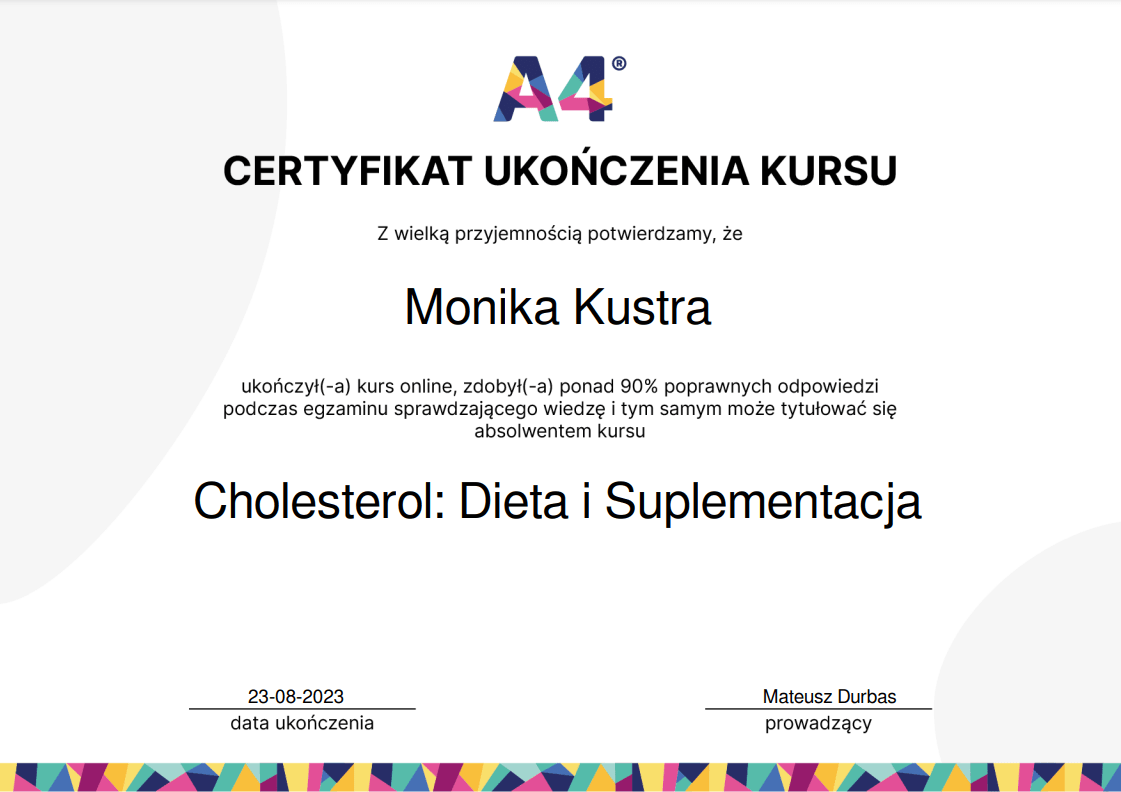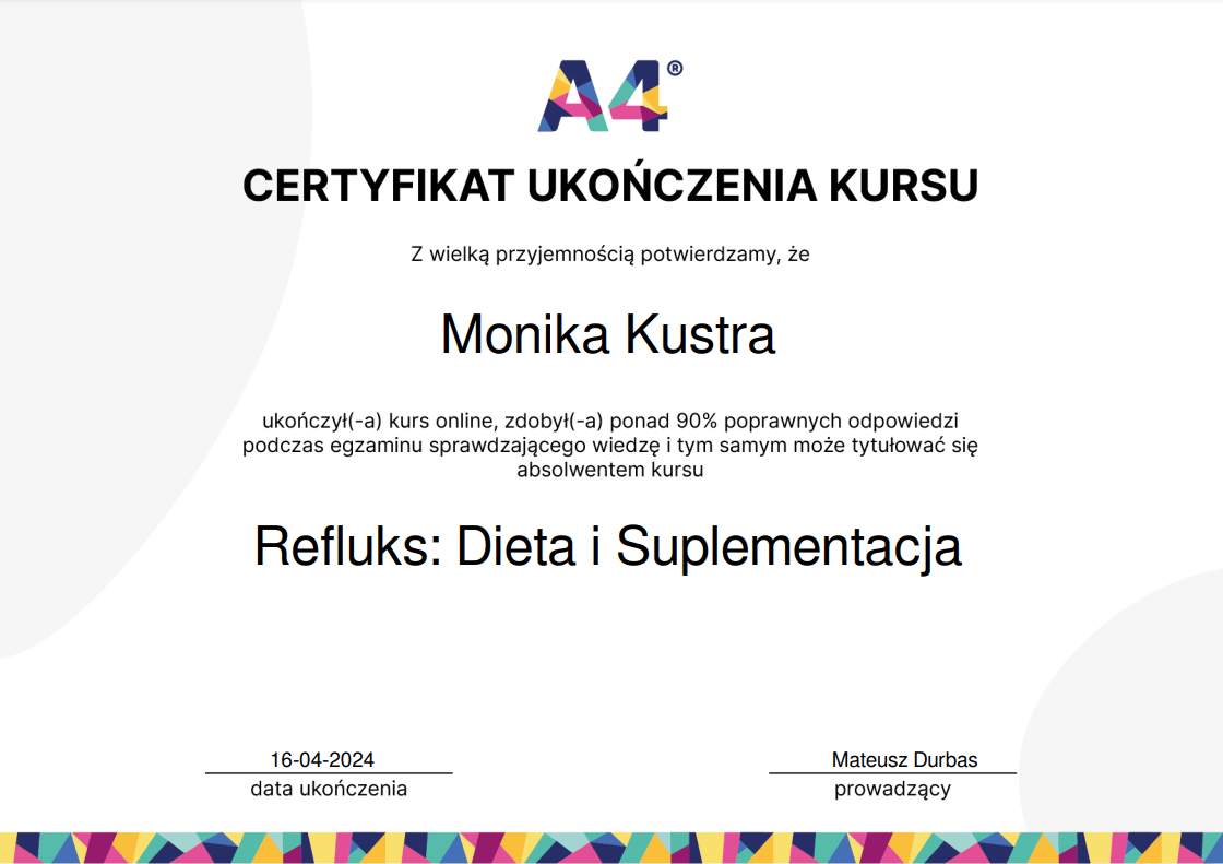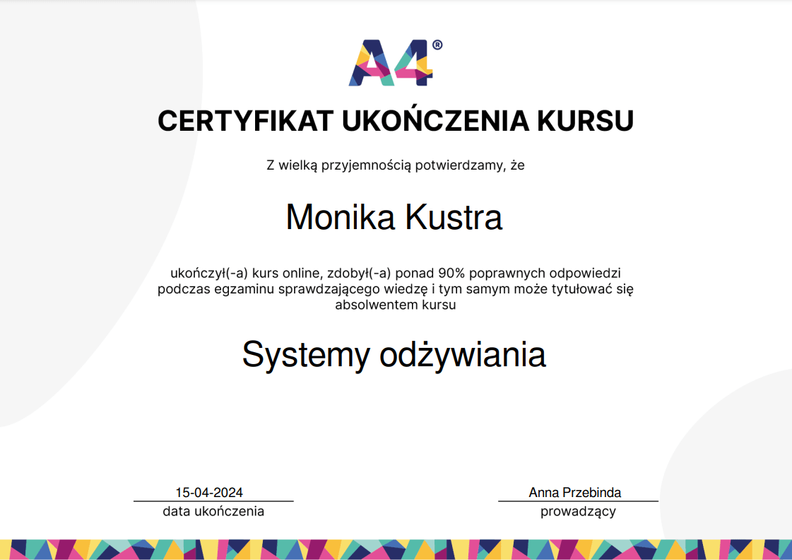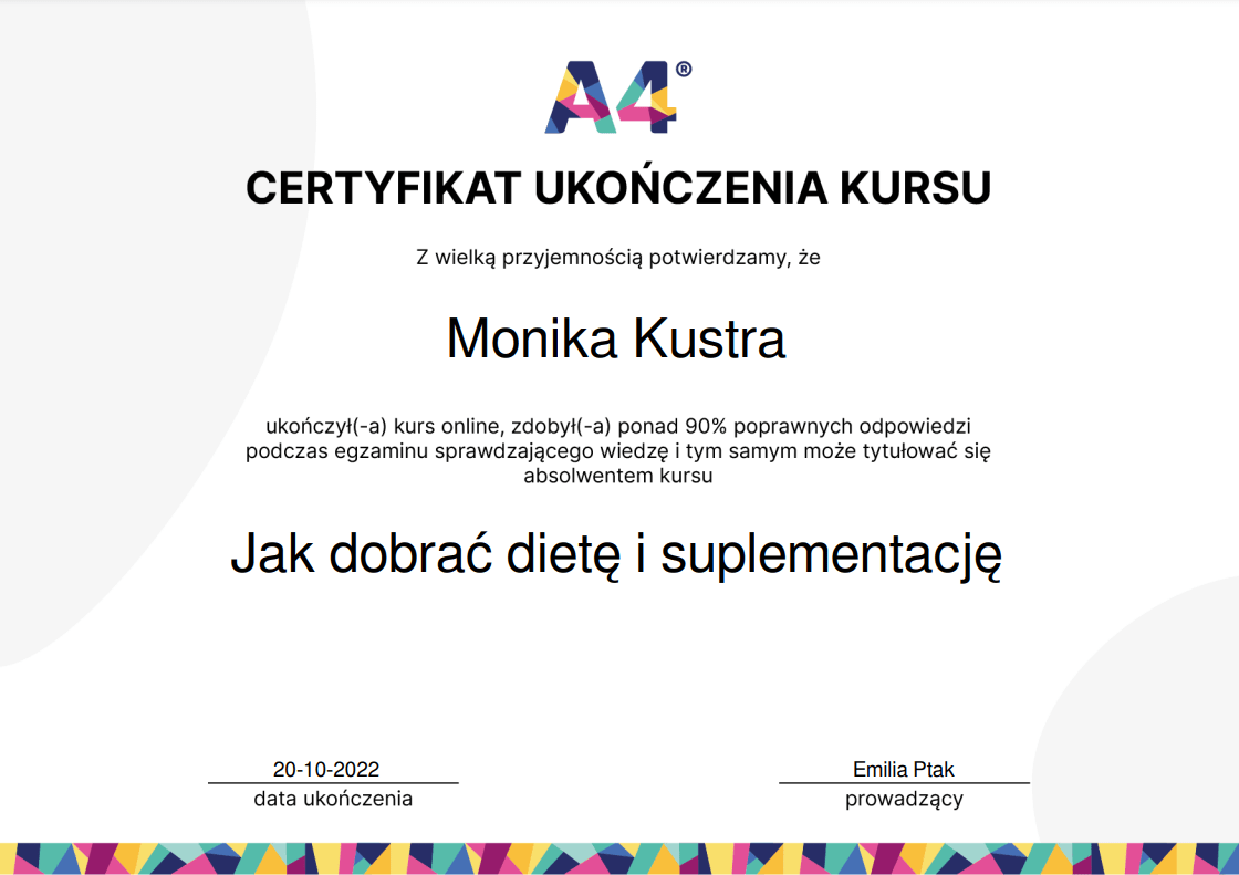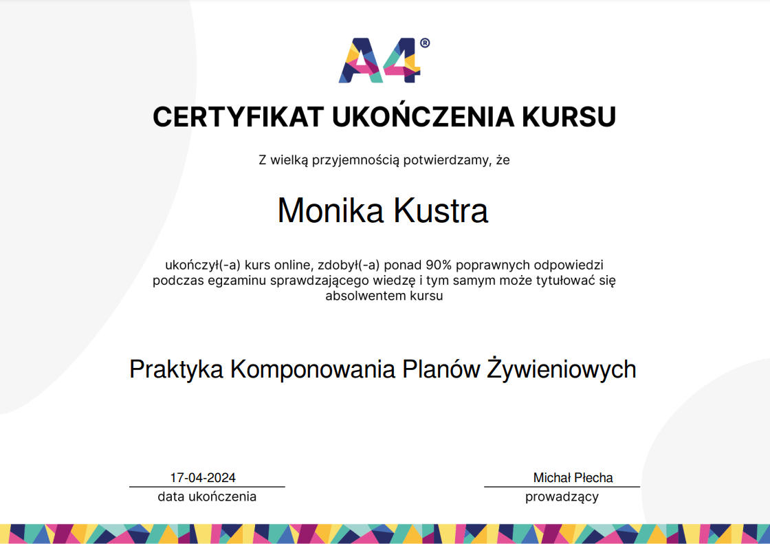 Nieustannie poszerzam swoją wiedzę – ukończyłam wiele szkoleń z psychodietetyki, diet coachingu oraz dietoterapii w różnych schorzeniach, takich jak choroby tarczycy, nerek czy cukrzyca. Wierzę, że indywidualne podejście to klucz do sukcesu, dlatego oferuję Ci nie tylko wiedzę, ale i wsparcie na każdym etapie naszej współpracy.